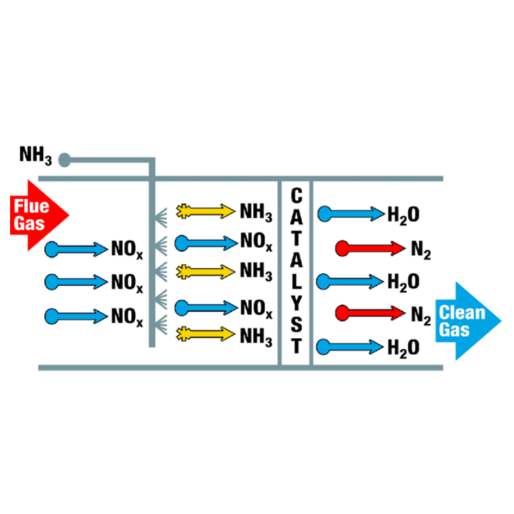 ในระบบ SCR จะมีการฉีด แอมโมเนีย (Ammonia – NH₃) หรือสารที่ปลดปล่อยแอมโมเนีย เช่น ยูเรีย (Urea) เข้าไปในกระแสไอเสีย โดยที่อุณหภูมิระหว่าง 180–400°C และในสภาวะที่มี ตัวเร่งปฏิกิริยา (Catalyst) สารเหล่านี้จะทำปฏิกิริยากับ ไนตริกออกไซด์ (NO) และ ไนโตรเจนไดออกไซด์ (NO₂) เพื่อเปลี่ยนเป็น ไนโตรเจนบริสุทธิ์ (N₂) และ ไอน้ำ (H₂O)