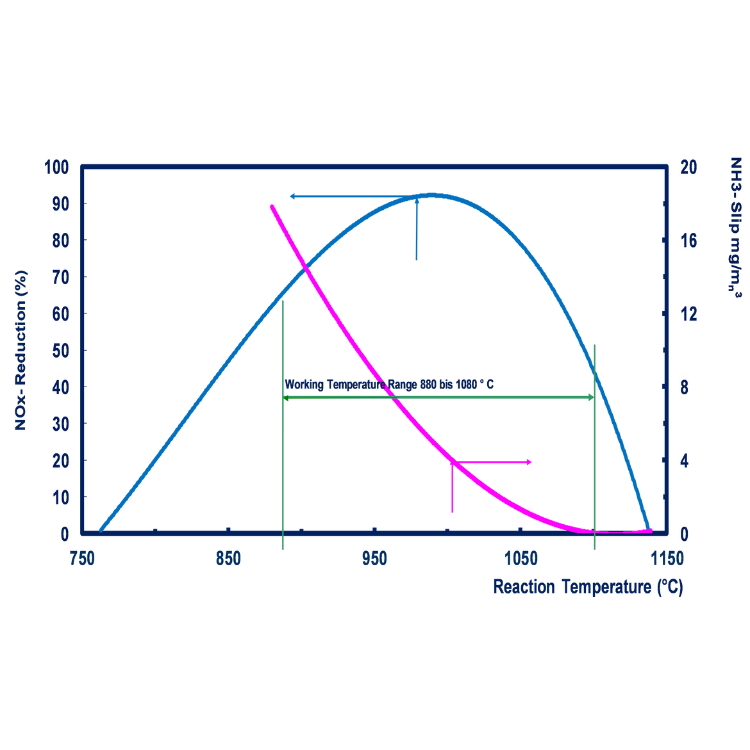 กระบวนการ SNCR จะทำงานที่ช่วงอุณหภูมิไอเสียประมาณ 850–1,100°C โดยจะฉีดสารรีดิวซ์ (Reducing Agent) เช่น แอมโมเนีย (Ammonia – NH₃) หรือ ยูเรีย (Urea) เข้าสู่กระแสไอเสีย สารเหล่านี้จะทำปฏิกิริยากับ ไนตริกออกไซด์ (NO) และ ไนโตรเจนไดออกไซด์ (NO₂) แปลงเป็น ไนโตรเจนบริสุทธิ์ (N₂) และ ไอน้ำ (H₂O) โดยไม่ต้องใช้ตัวเร่งปฏิกิริยา (Catalyst)